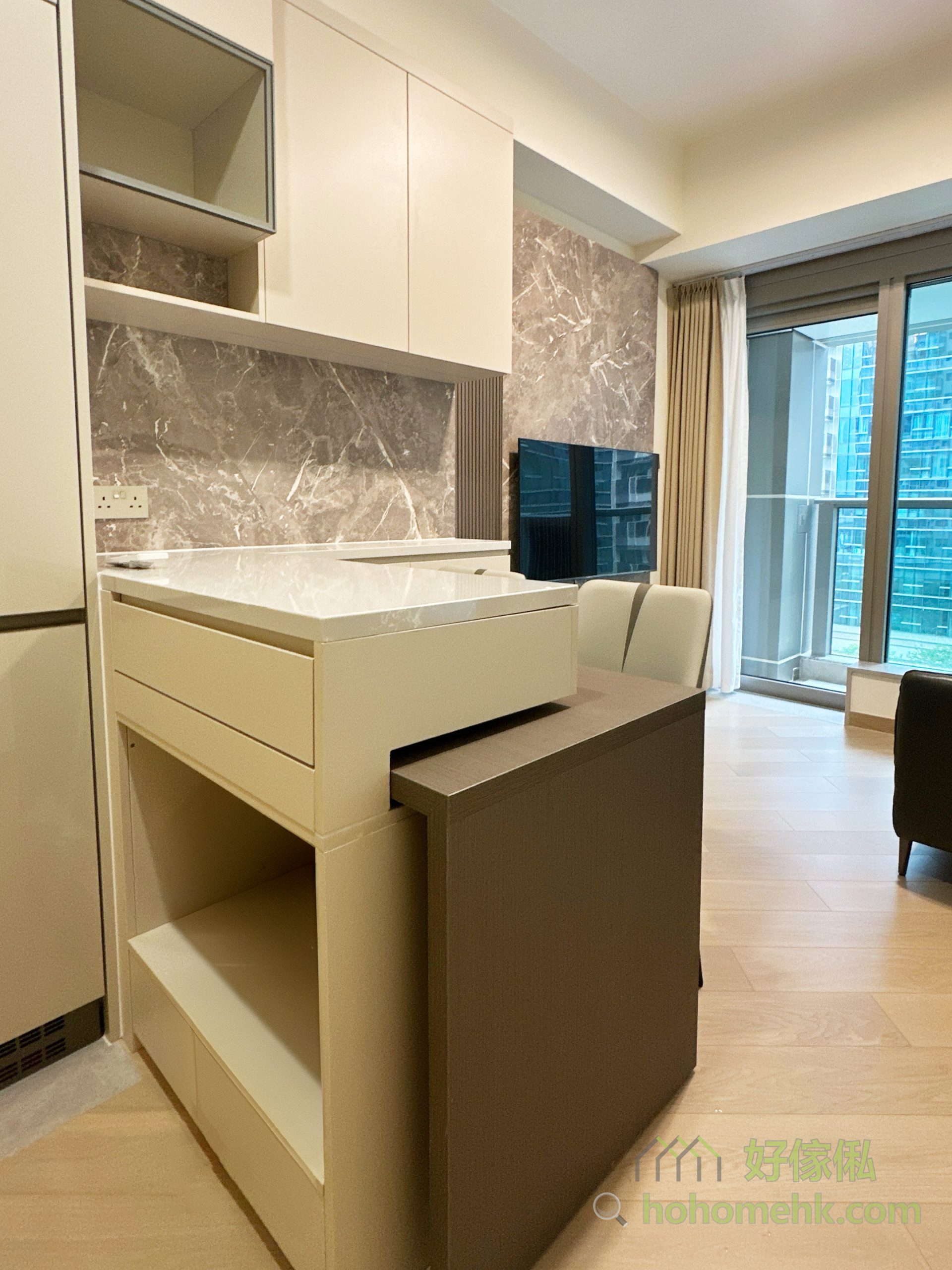 廳櫃與吧枱的設計不僅是廚房與客廳的分隔,更能透過石面枱面的延伸大幅增加廚櫃的工作枱面。特別是錯層的創新設計,讓餐枱藏於吧枱之下,需要時可拉出變成獨立餐枱,節省空間之餘,亦讓中島更具層次感與特色,滿足現代家庭對靈活性的需求。廳櫃與吧枱的設計不僅是廚房與客廳的分隔,更能透過石面枱面的延伸大幅增加廚櫃的工作枱面。特別是錯層的創新設計,讓餐枱藏於吧枱之下,需要時可拉出變成獨立餐枱,節省空間之餘,亦讓中島更具層次感與特色,滿足現代家庭對靈活性的需求。廳櫃與吧枱的設計不僅是廚房與客廳的分隔,更能透過石面枱面的延伸大幅增加廚櫃的工作枱面。特別是錯層的創新設計,讓餐枱藏於吧枱之下,需要時可拉出變成獨立餐枱,節省空間之餘,亦讓中島更具層次感與特色,滿足現代家庭對靈活性的需求。廳櫃與吧枱的設計不僅是廚房與客廳的分隔,更能透過石面枱面的延伸大幅增加廚櫃的工作枱面。特別是錯層的創新設計,讓餐枱藏於吧枱之下,需要時可拉出變成獨立餐枱,節省空間之餘,亦讓中島更具層次感與特色,滿足現代家庭對靈活性的需求。客廳電視地櫃懸空設計,不僅增加視覺上的輕盈感,還能有效利用底部空間作為清潔機械人的行走路線,方便打掃。同時,燈帶的應用讓櫃體周邊充滿層次感,為簡約的家居注入精緻細節。電視背景牆選用了粗獷的石紋元素作為設計主角,視覺效果搶眼卻不顯花巧,與客廳整體色調完美融合。配搭懸空電視地櫃的設計,讓背景牆的橫樑底部騰出空間安裝燈帶,柔和的滲光效果為家居增添一份溫馨氛圍。睡房的床頭板設計獨具匠心,直接延伸至整幅牆身,既保護了牆身避免日常使用的磨損,亦讓房間的整體風格更統一。簡約的線條與柔和的色調,營造出一個舒適又具設計感的私人空間。