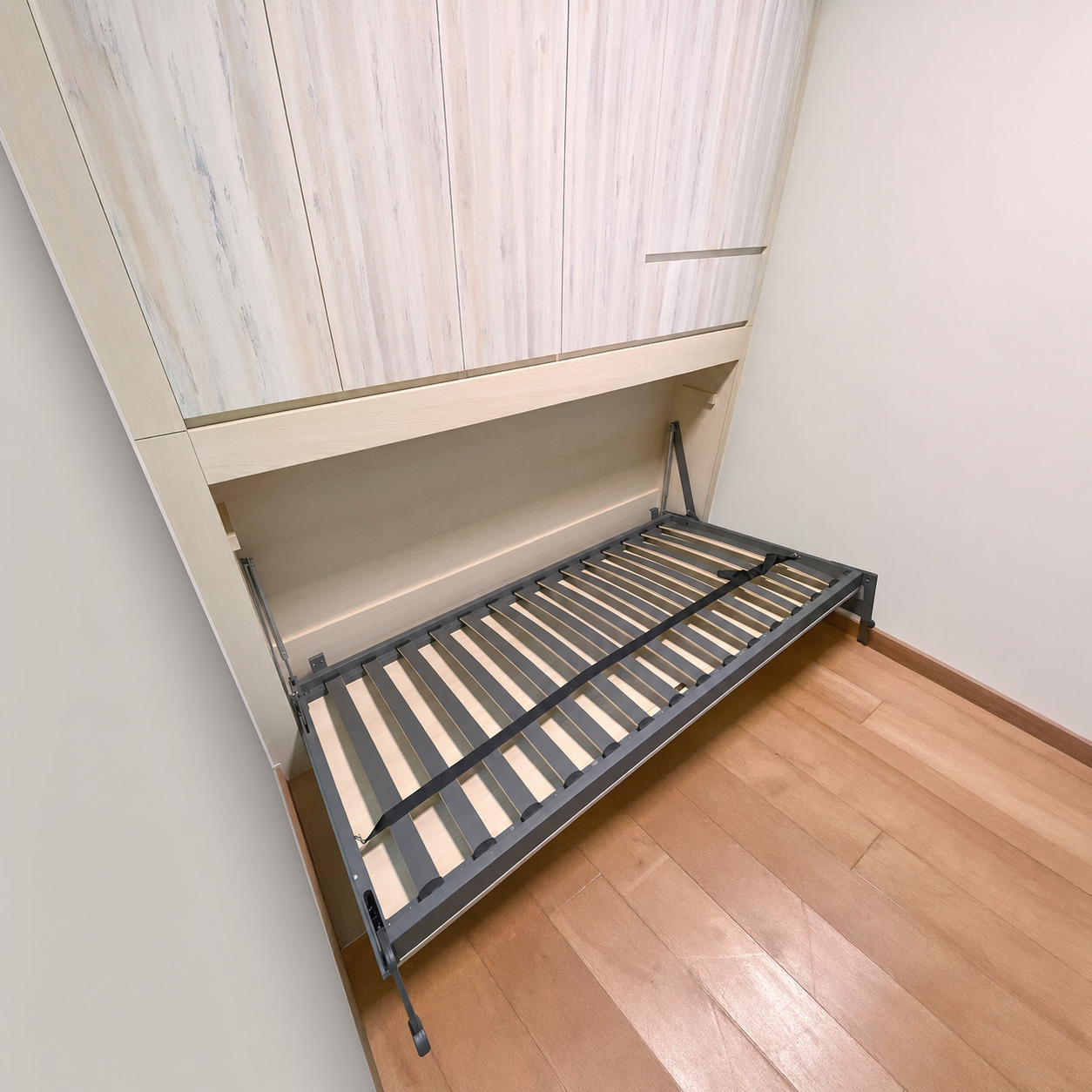 我们的公司的隐形床选用环保E1实木细芯夹板,承托力好,可承受600kg 的重量。而且饰面有易于清洁打理、耐高温耐腐蚀、防花耐磨等多个特点。变形床的外围的傢俬均可以度尺定制,例如搭配吊柜、衣柜、柜桶储物柜等、每个储物空间都可以自由规划,帮你整齐地整理家居杂物,用尽每一寸空间。