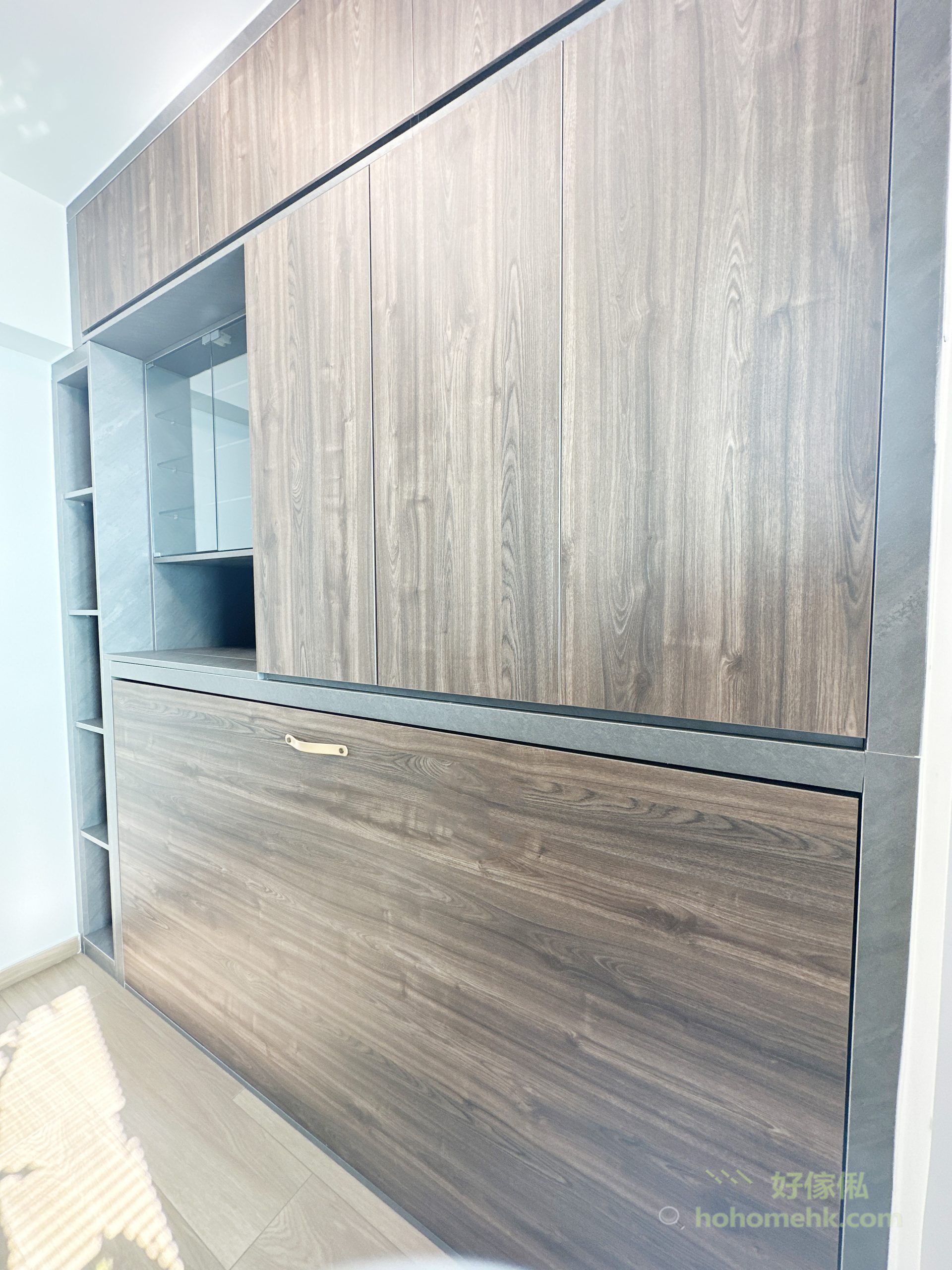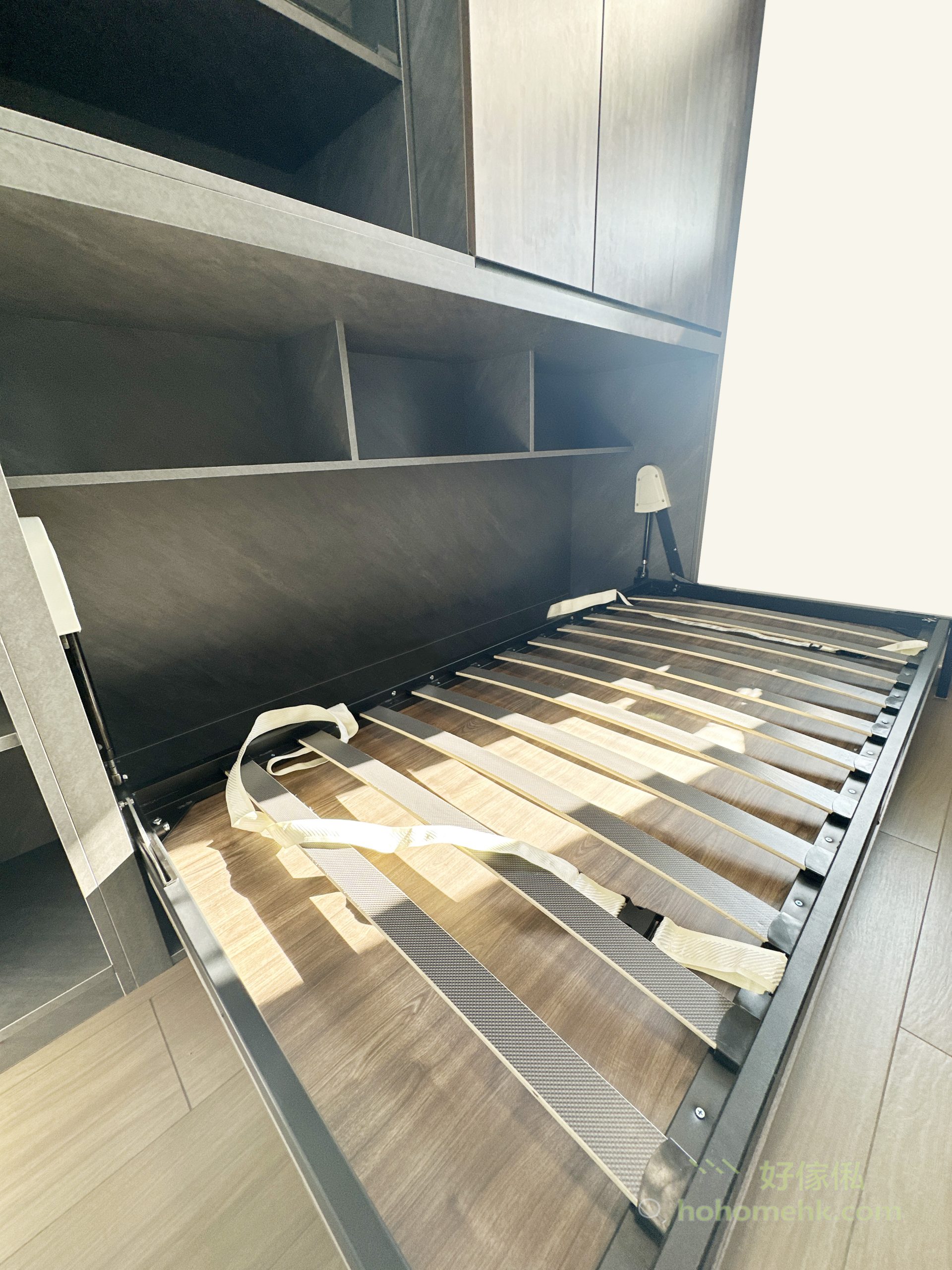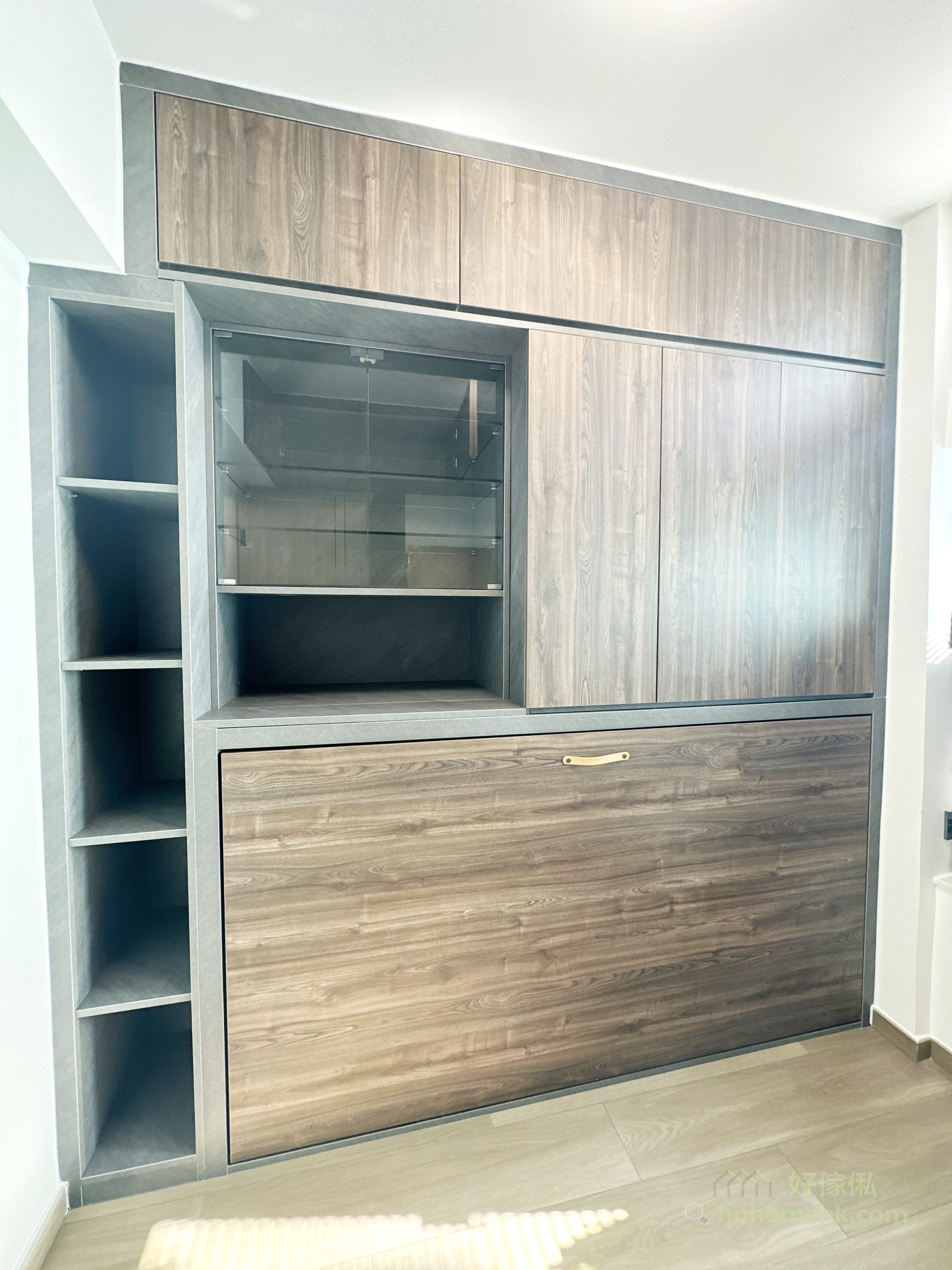 书柜上方的吊柜提供了额外的储物空间,可以存放不常用的物品,例如换季衣物或文件,进一步提高空间利用率。这款侧翻床连书柜的设计灵活多变,不仅充分利用了垂直空间,还兼顾了储物、展示与睡眠功能,特别适合香港这类空间有限的居住环境。无论是提升家居的实用性,还是增添视觉上的层次感,这款设计都能满足你的需求。如果你也想拥有这样的多功能家居,欢迎联络好家私,为你量身订造理想的家居设计!