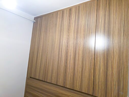 间牆衣柜打横分隔出两间房。外面做了一个间房牆,间房牆有两个隐形趟门和透气气窗。间房衣柜分成上下两部份,分别给不同房间使用。上部份供有地台和衣柜的房间使用,而下部份则是供另一间房使用。
