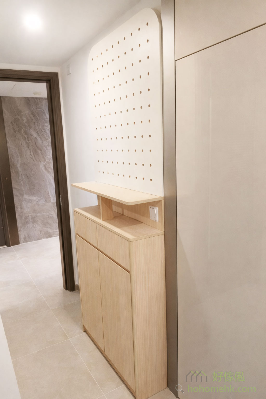 为了一进门就感受到整洁与美观,我们的设计师特别为客户设计了一款半腰鞋柜,柜顶搭配时下流行的到顶洞洞板。不但提供充足的收纳空间放鞋,洞洞板还可以灵活挂放家居用品或装饰物,让门口成为展示个人风格的小角落。