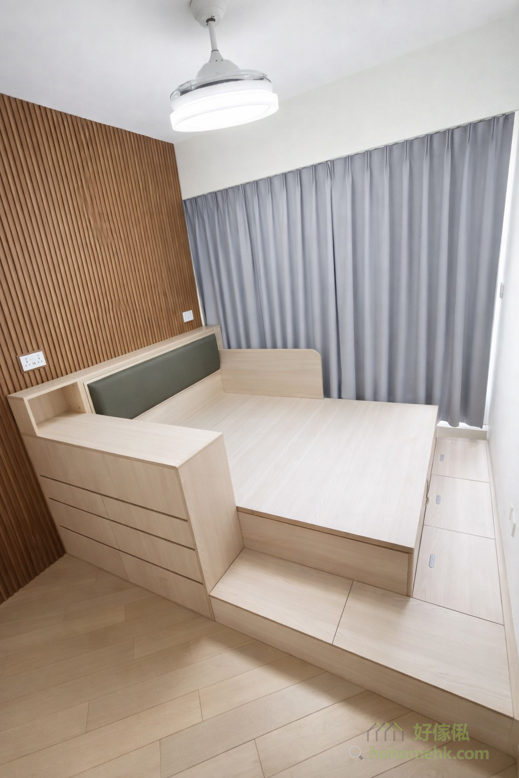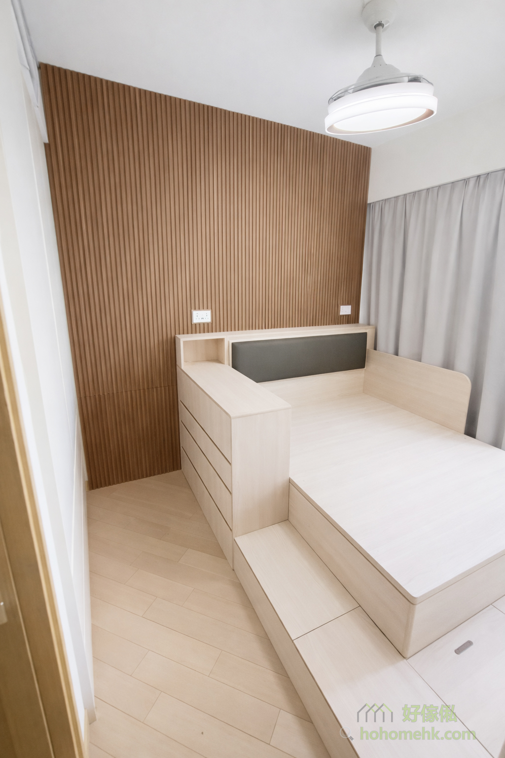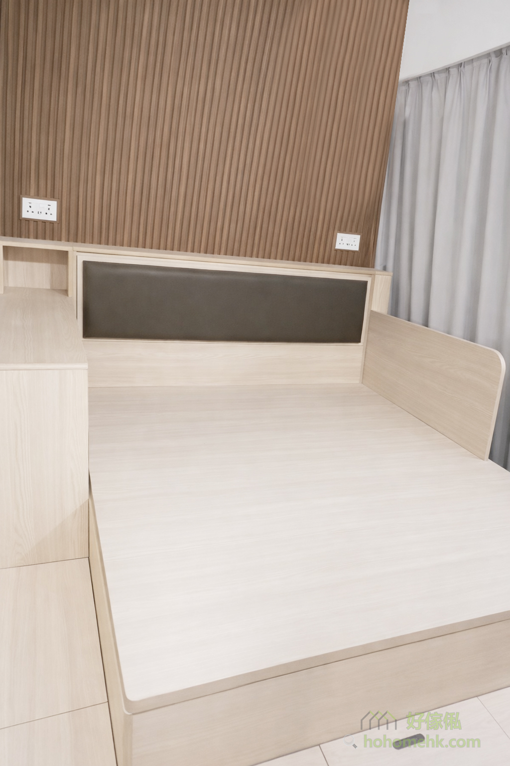 靠窗位置的油压床特别设计了侧板,不仅避免窗帘影响睡眠,还多了一份安全感。这项设计既保护了用户的隐私,也让空间更有包围感,同时亦可以防止床褥移位,为整个睡房增添了贴心的细节。