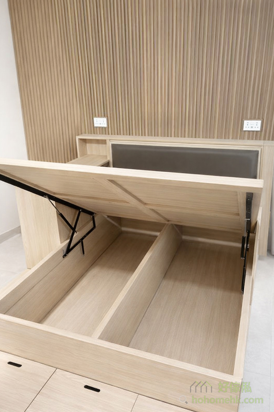 床箱内部采用油压式设计,轻轻一拉即可揭开,加上还做储物地台,加高了整体的收纳量,内部储物空间非常充裕,可用于存放被褥、换季衣物等。这样的设计充分利用了床底空间,对于香港的细单位而言,是解决储物问题的最佳方案。