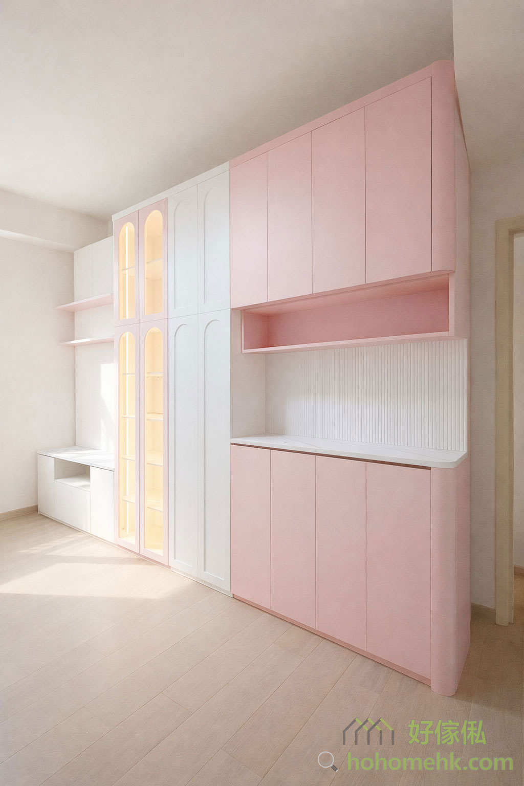 我们的客人订造家私给小朋友时,如果小朋友已经开始有自己的主见,他们都会带小朋友来门市一齐为自己的床和柜拣颜色,让小朋友出一分力。今次的上床下书枱组合,便采用了小客人喜欢的粉红色配白色的组合订造而成,马卡龙色调的粉红色,偏淡色,不会将全间房都照得红红的,效果比传统的鲜粉红更柔和、不刺眼,更适合小朋友至少女阶段使用。