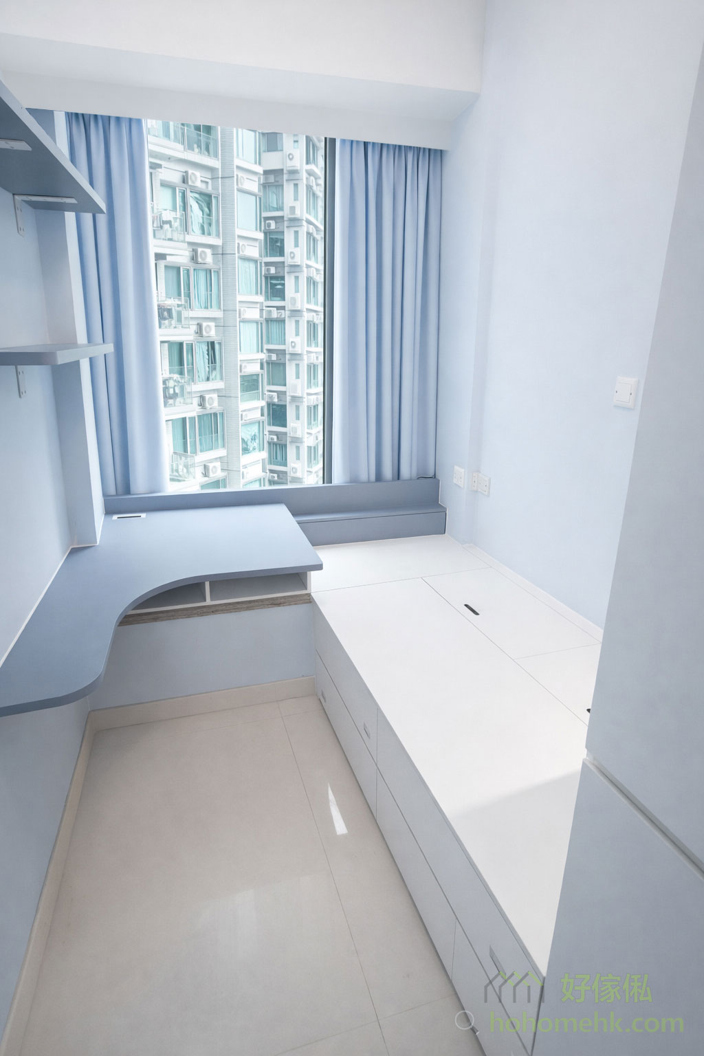 单人床与书桌连接的地方也使用了斜角设计,呼应斜角牆壁柜,让整个空间的风格更加统一。