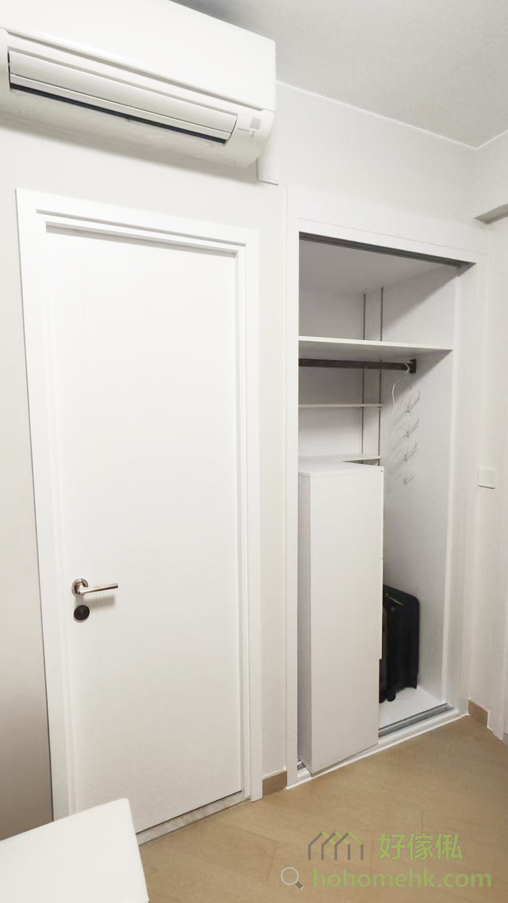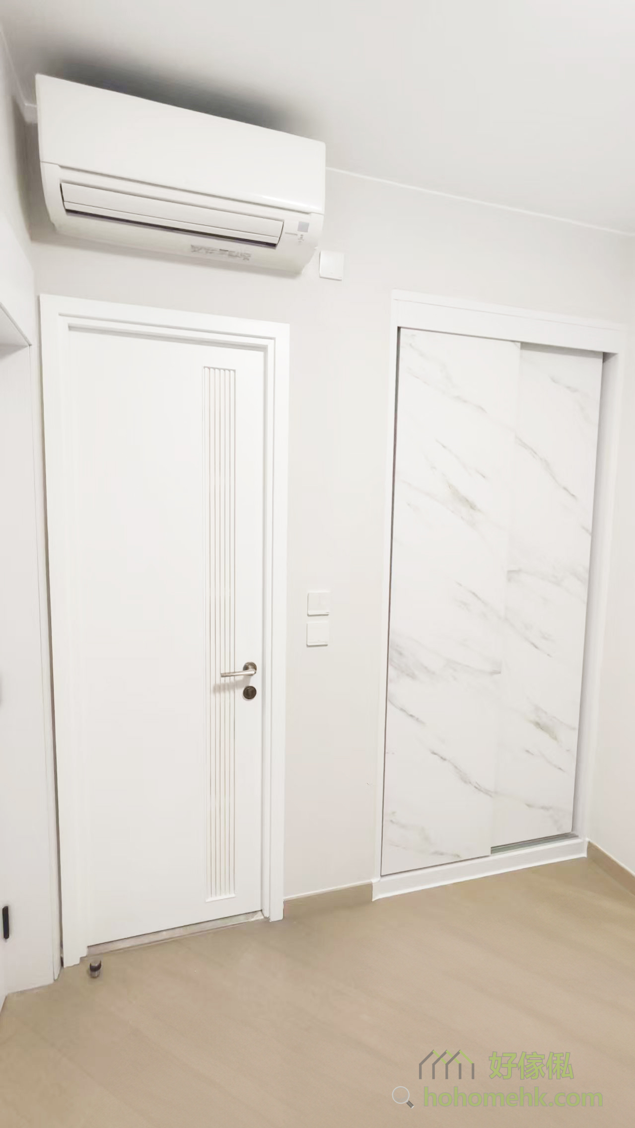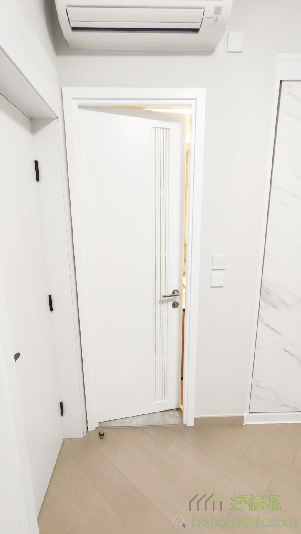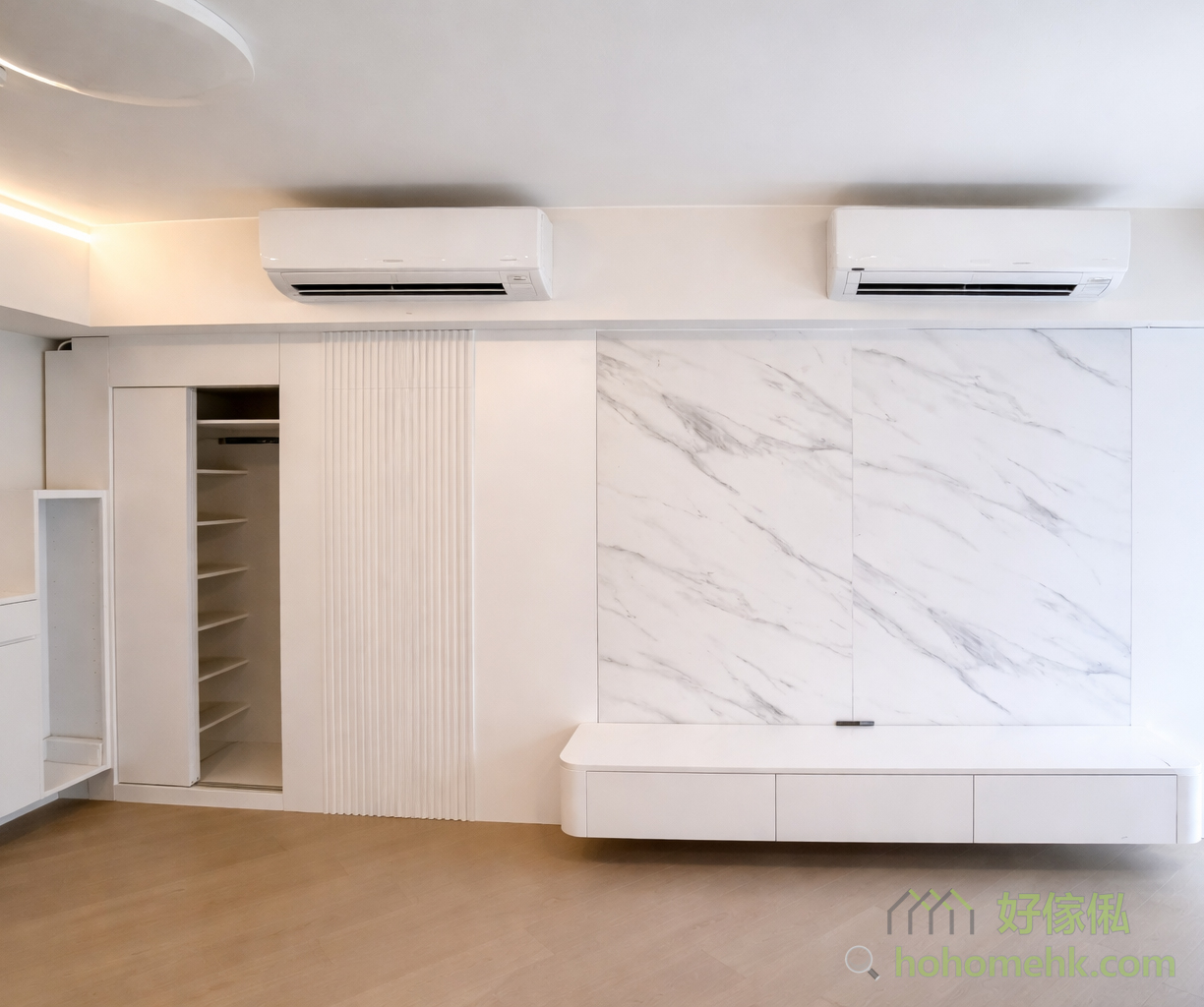 以背景墙完美融入隐形门,除了提升空间一体性外,还隐藏了房门及储物柜,令视线更加纯粹。此设计大大提升空间利用率,尤其适合香港的中小型住宅,让每一吋空间显得井井有条。