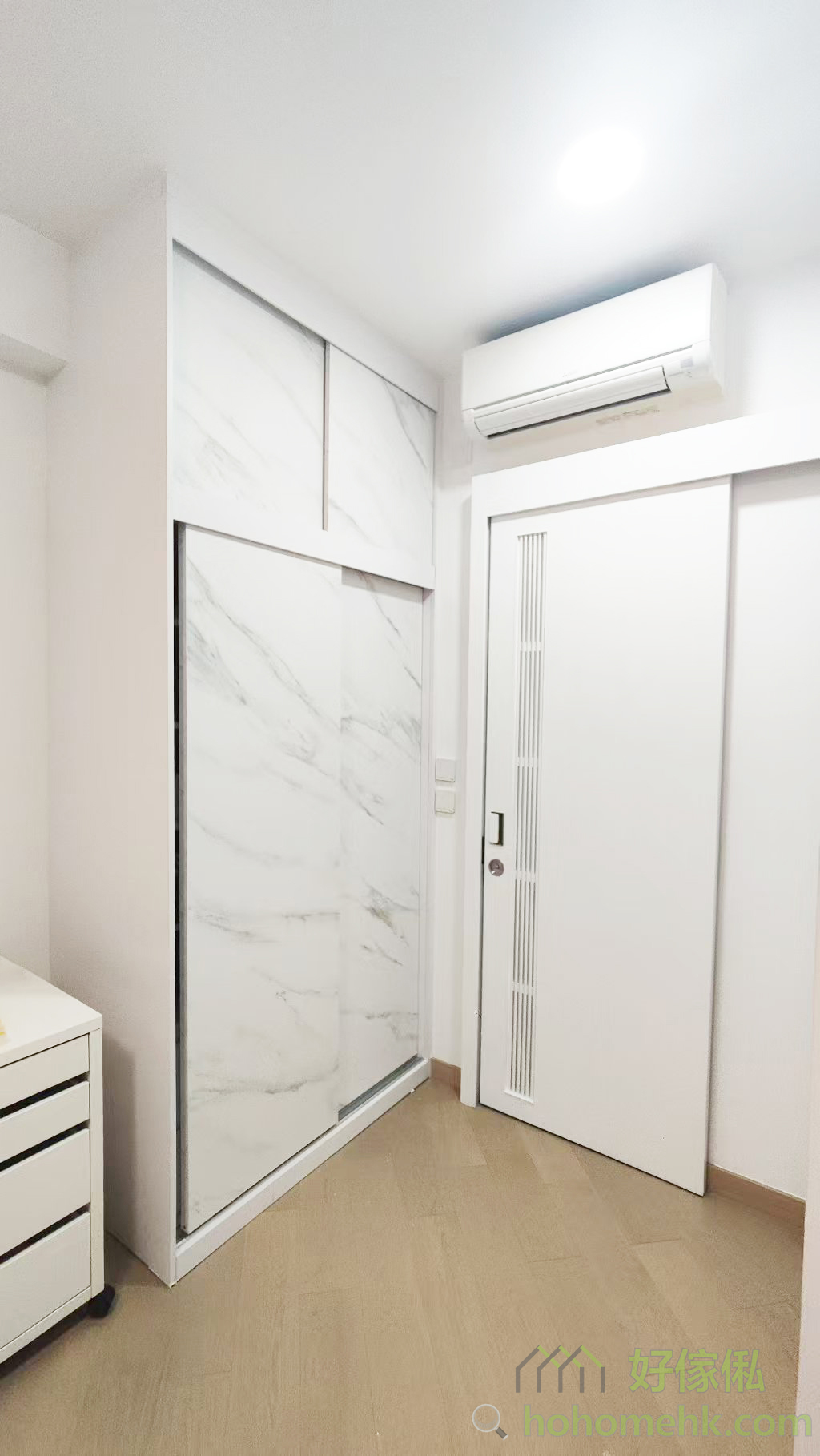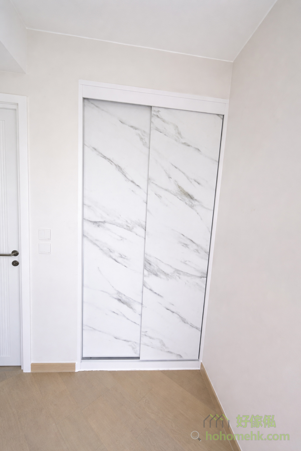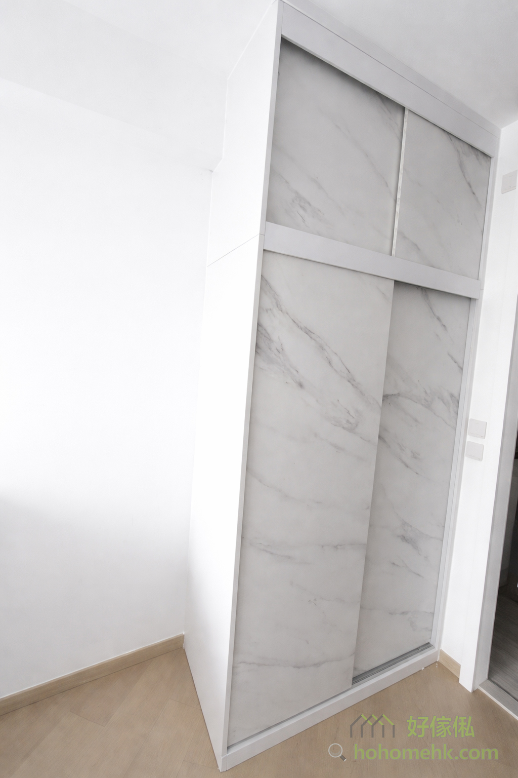 房内的衣柜亦沿用电视柜及背景墙的板材及纹理,确保全屋设计风格一致。大理石纹的衣柜简约时尚,实用之余更显生活品味。这种设计不仅耐看,亦符合现代人对简约生活的追求。