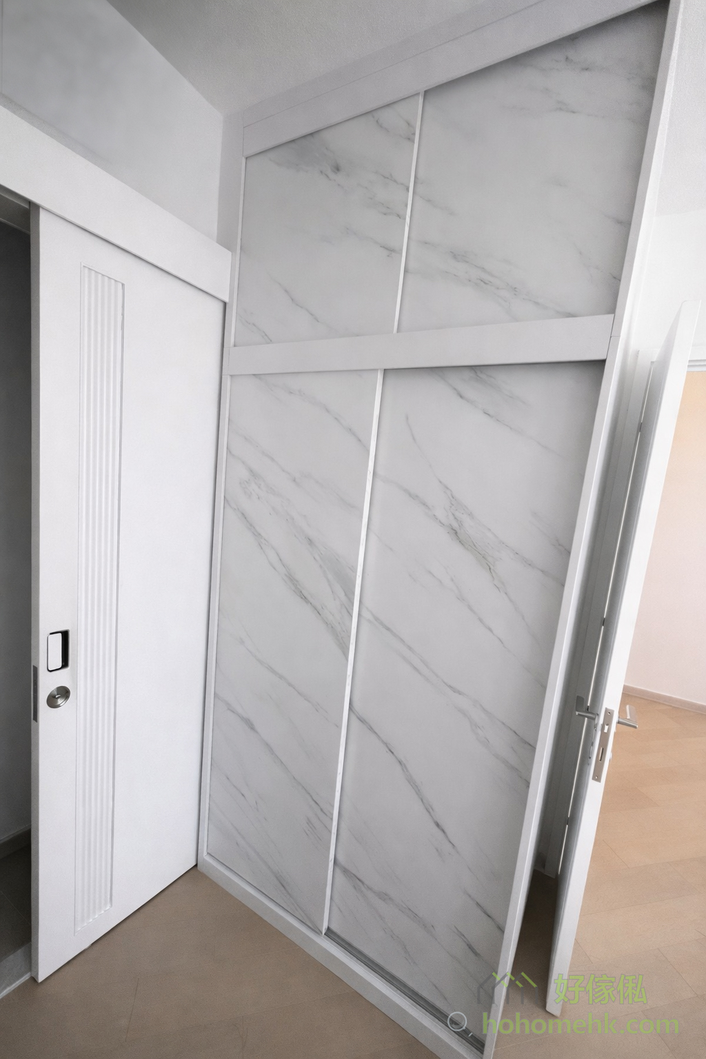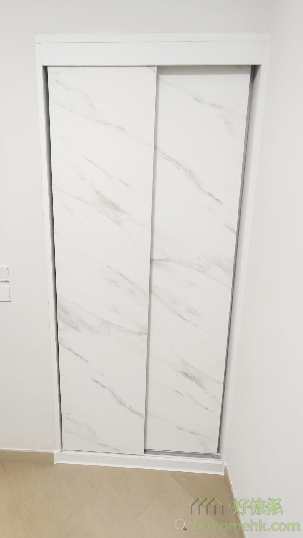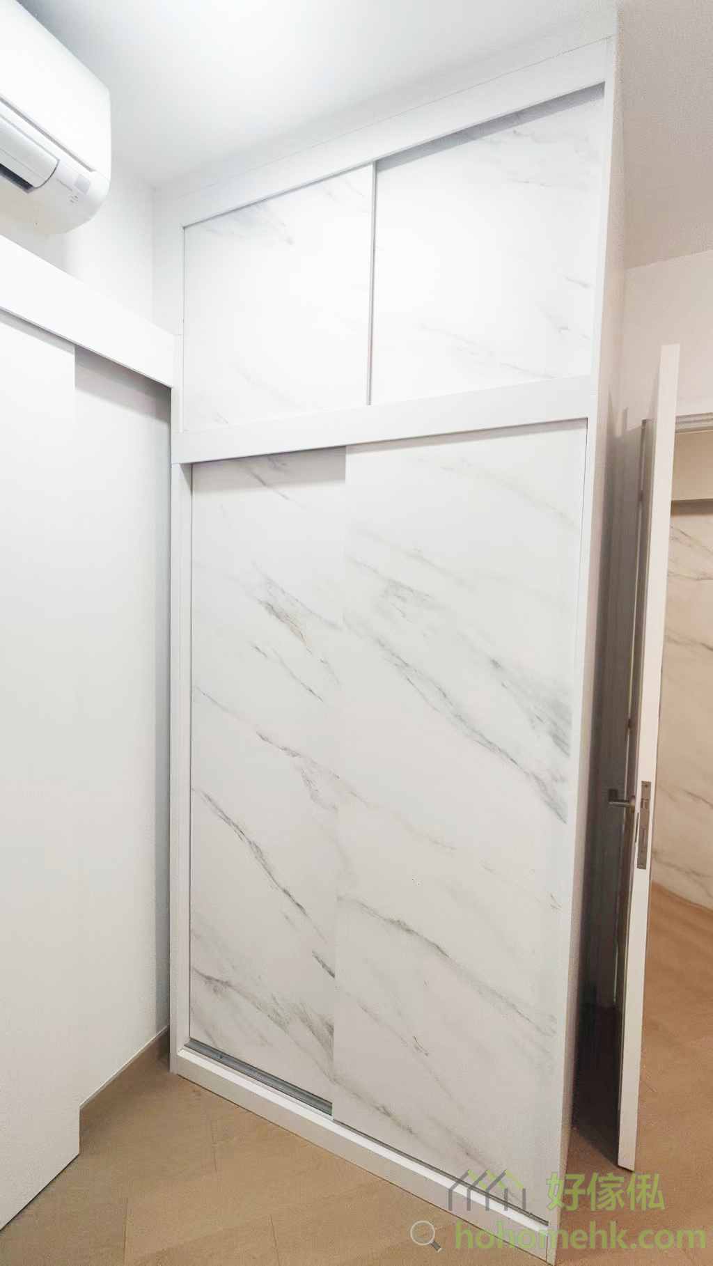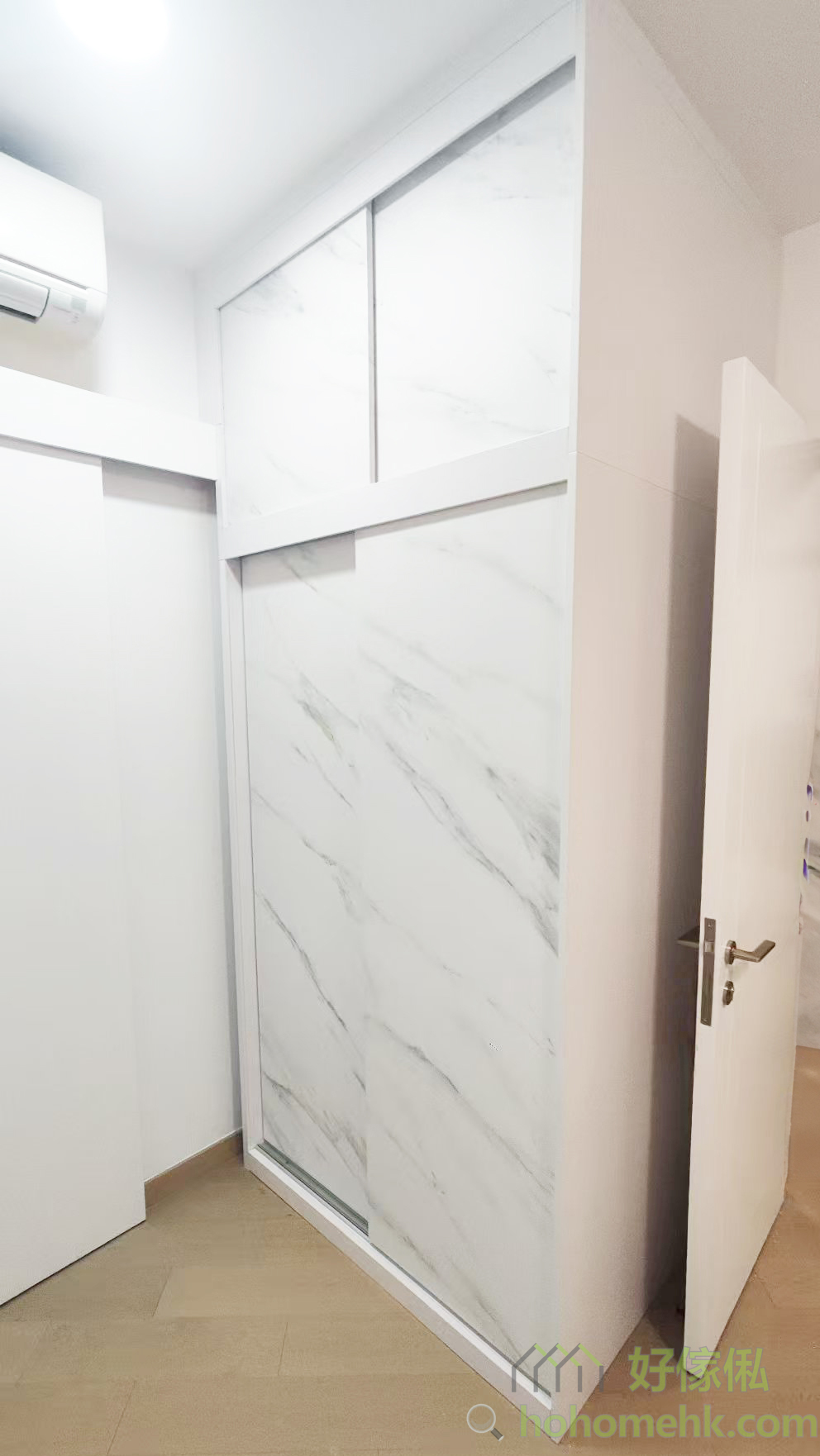 房内的衣柜亦沿用电视柜及背景墙的板材及纹理,确保全屋设计风格一致。大理石纹的衣柜简约时尚,实用之余更显生活品味。这种设计不仅耐看,亦符合现代人对简约生活的追求。