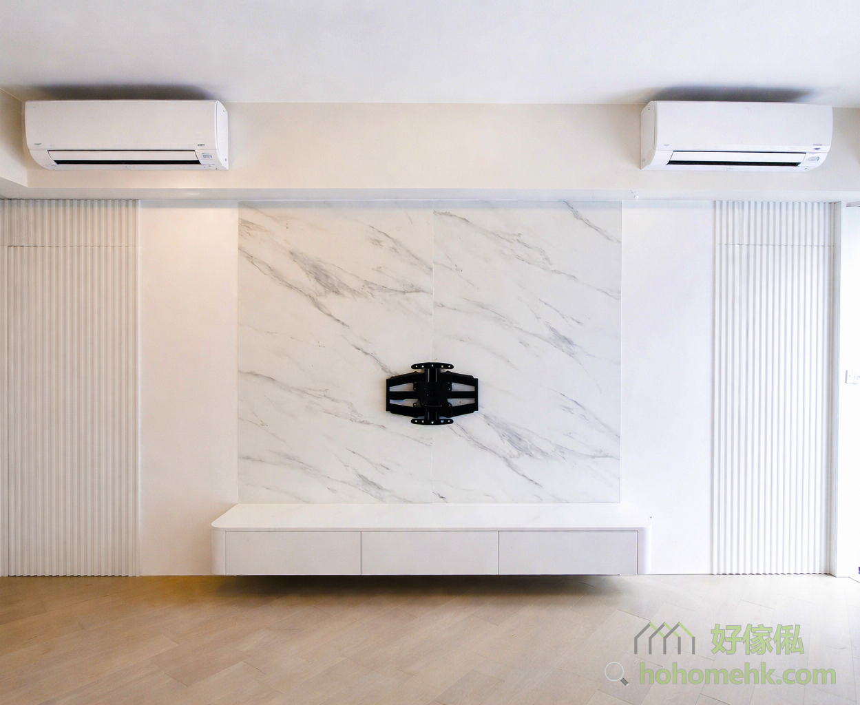 订造电视柜时,背景墙设计绝对是不容忽视的重点。背景墙不仅在视觉上成为客厅的焦点,更能利用隐形门设计,巧妙将走廊及房门隐藏起来,令整体空间看起来更加整洁一致。同时,搭配白色大理石纹理板材,为客厅增加高贵时尚的感觉。