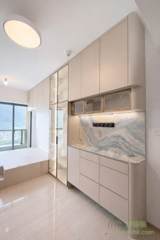 长方形开则的客厅,可以透过订造地台将客饭厅自然分区。地台设计不仅能提供额外储物空间,其出色的承重力更能承托梳化等大型家具。同时,地台的高度令电视柜实现「做到顶」的设计,最大化利用墙面空间,而梳化上方的吊柜也变得方便拿取,赋予生活更多便利。