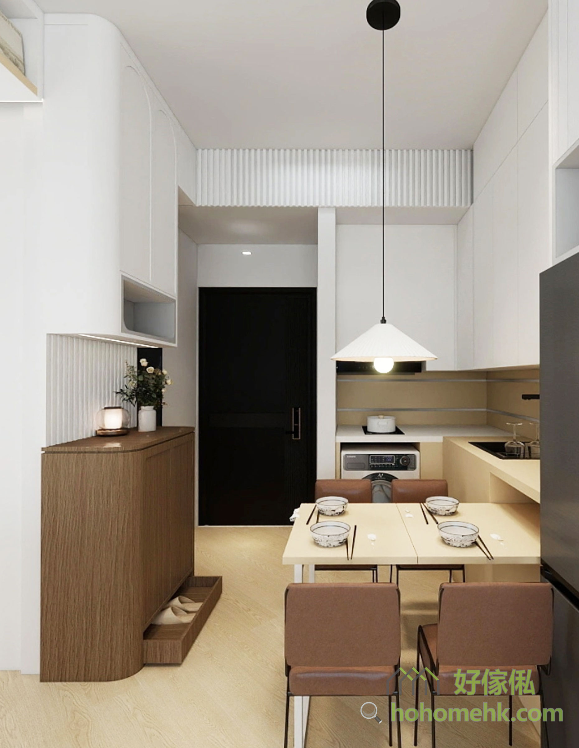 选用趟门间房可以增加房间内的实用空间,不浪费任何的储物位置。厅柜的C字位做得比较特别,靠门口的位置做得比较高,营造出特别的设计感。而C字柜亦做了一个嵌入式的伸缩餐桌的空间,不使用折叠桌时可以收起来,想用时可以轻松打开。利用这个设计,就算折叠桌坏了都可以轻易更换。