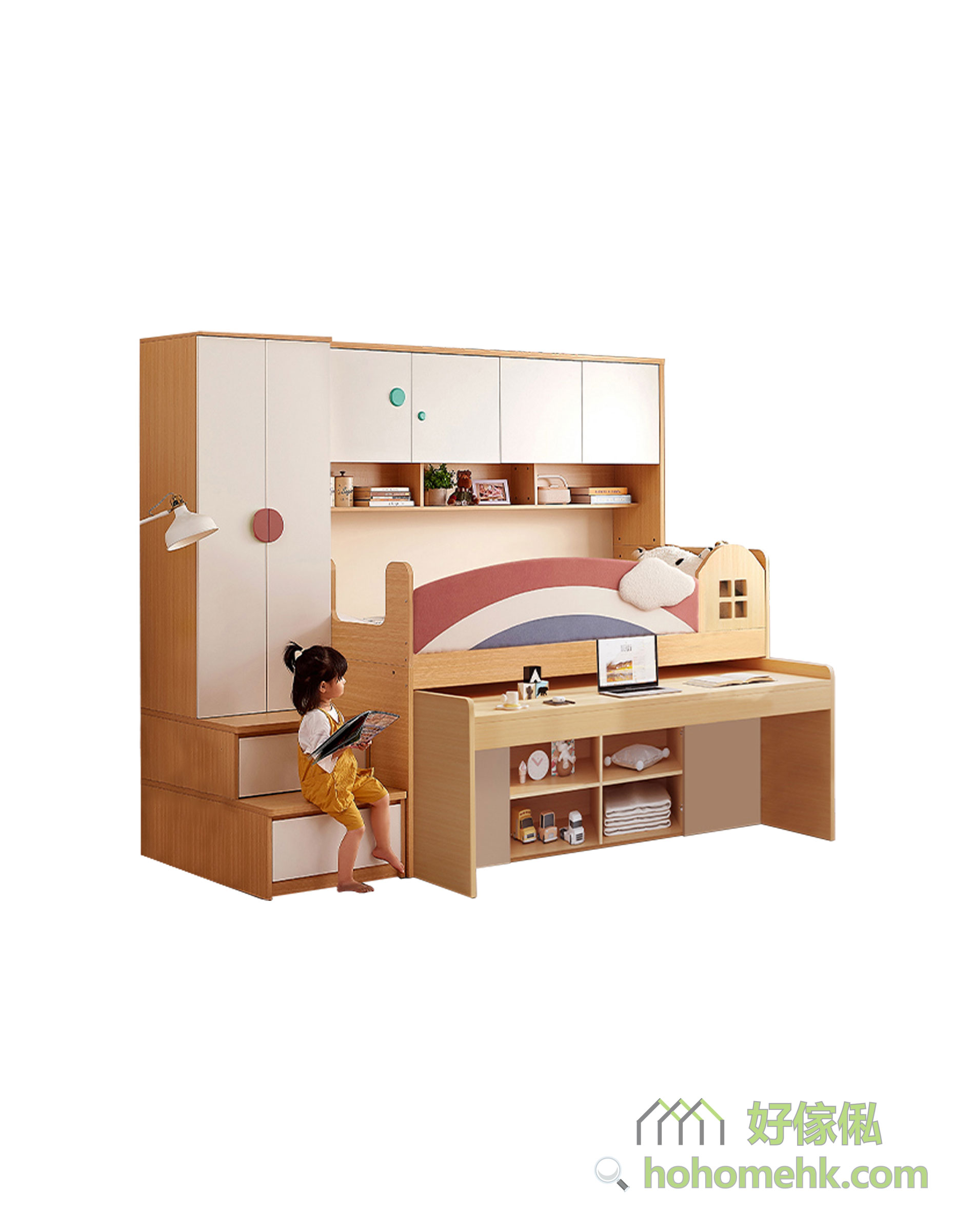 Riley儿童半高床带衣柜书枱组合,细单位必备家私,让小朋友有自己嘅独立空间