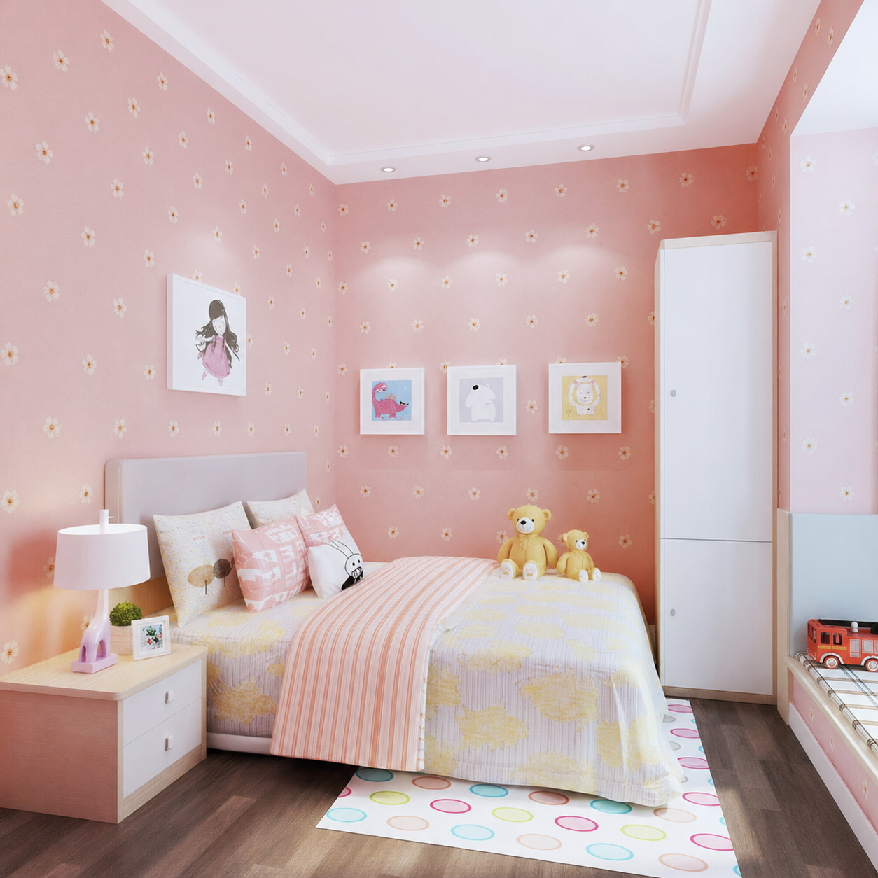 少女房间 粉色设计 曲尺书柜 组合柜 书桌 双人油压床 窗台榻榻米