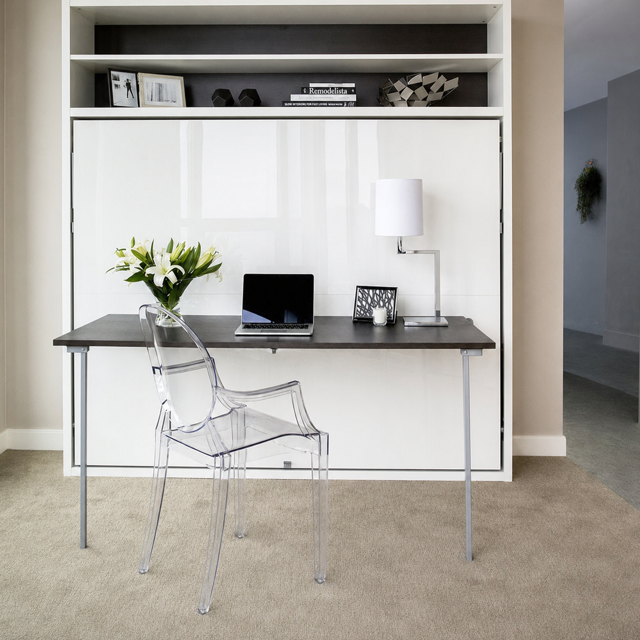 北角门市的书柜连侧翻床设计,连同办公室自成一国,如果客户需要为书房订造家私,都可以参考我们北角门市的设计,无论工作、收纳的空间都有,还可以随时开床变客房。